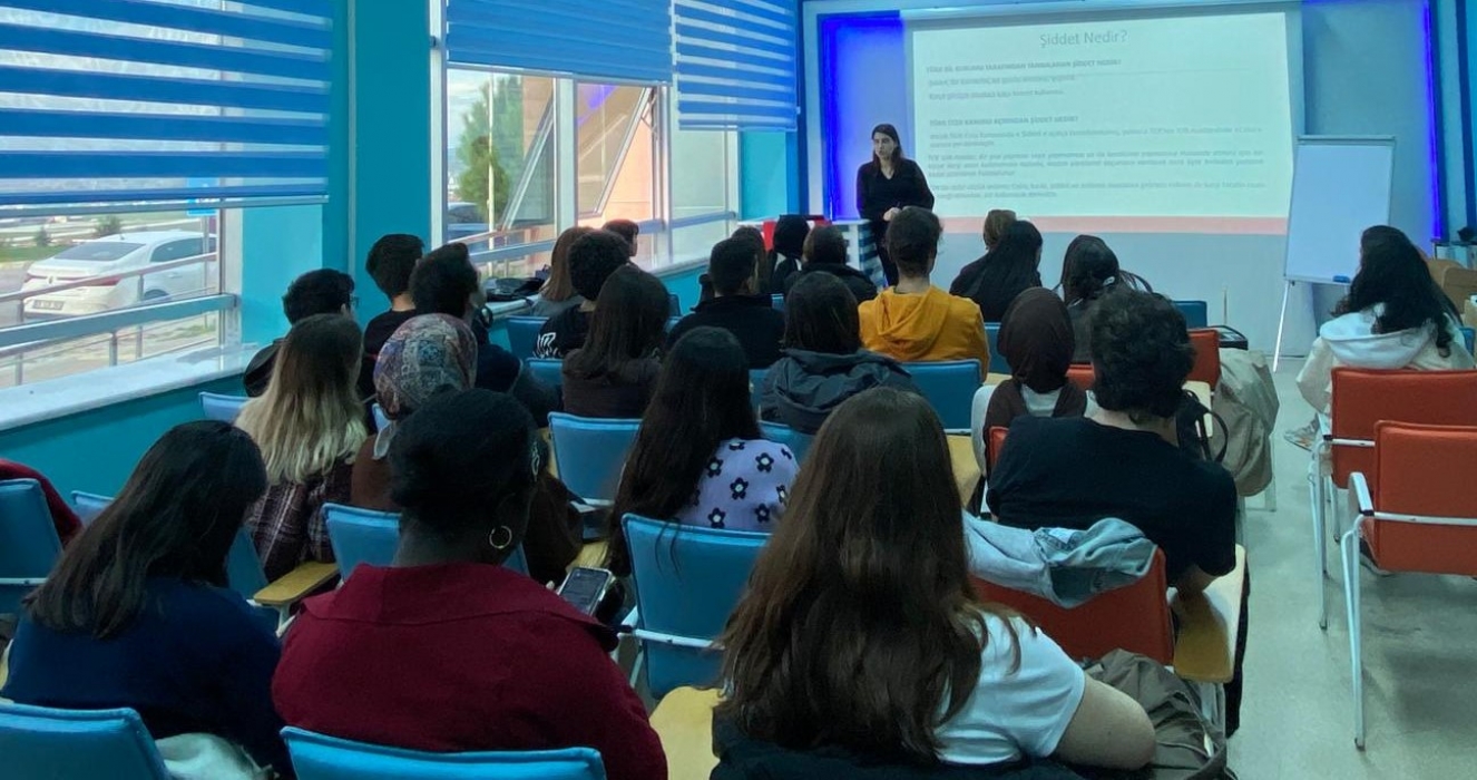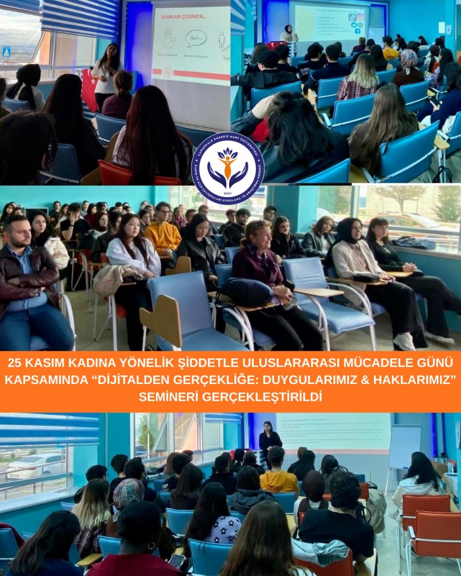 25 Kasım Kadına Yönelik Şiddete Karşı Uluslararası Mücadele Gününde, gündelik hayatta karşılaşılan şiddete karşı farkındalık yaratmak için Çanakkale Onsekiz Mart Üniversitesi (ÇOMÜ) Kadın ve Aile Çalışmaları Uygulama ve Araştırma Merkezi (KAM), Gençlik ve Spor İl Müdürlüğü ve Çanakkale Barosu ortaklığıyla düzenlenen “Dijitalden Gerçekliğe: Duygularımız & Haklarımız” başlıklı seminer Genç Ofis’te gerçekleştirildi. Etkinlikte gündelik hayatta ve sosyal medya mecralarında karşı karşıya kalınan şiddet, şiddetin yarattığı psikolojik durumlar ve başetme yöntemleri ile konunun hukuki boyutları hakkında bilgi verildi.